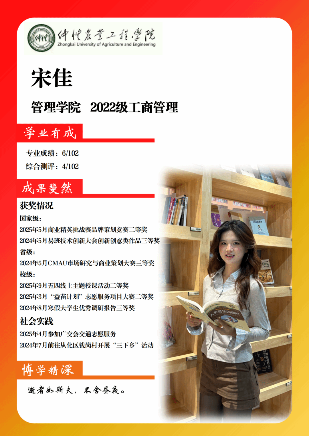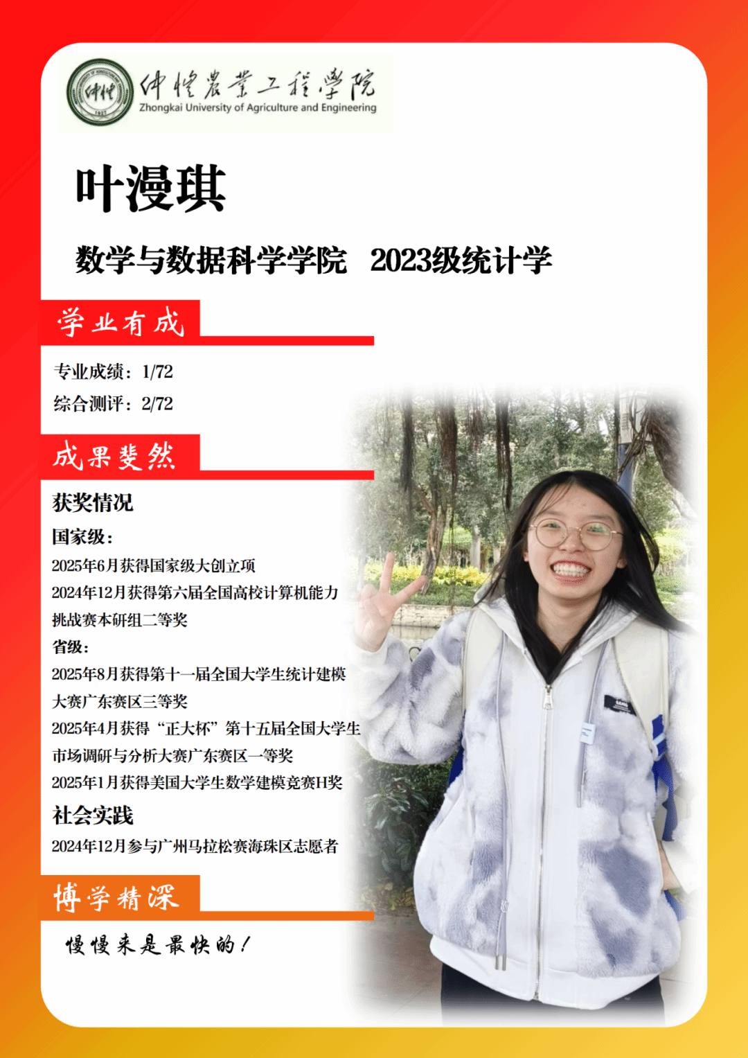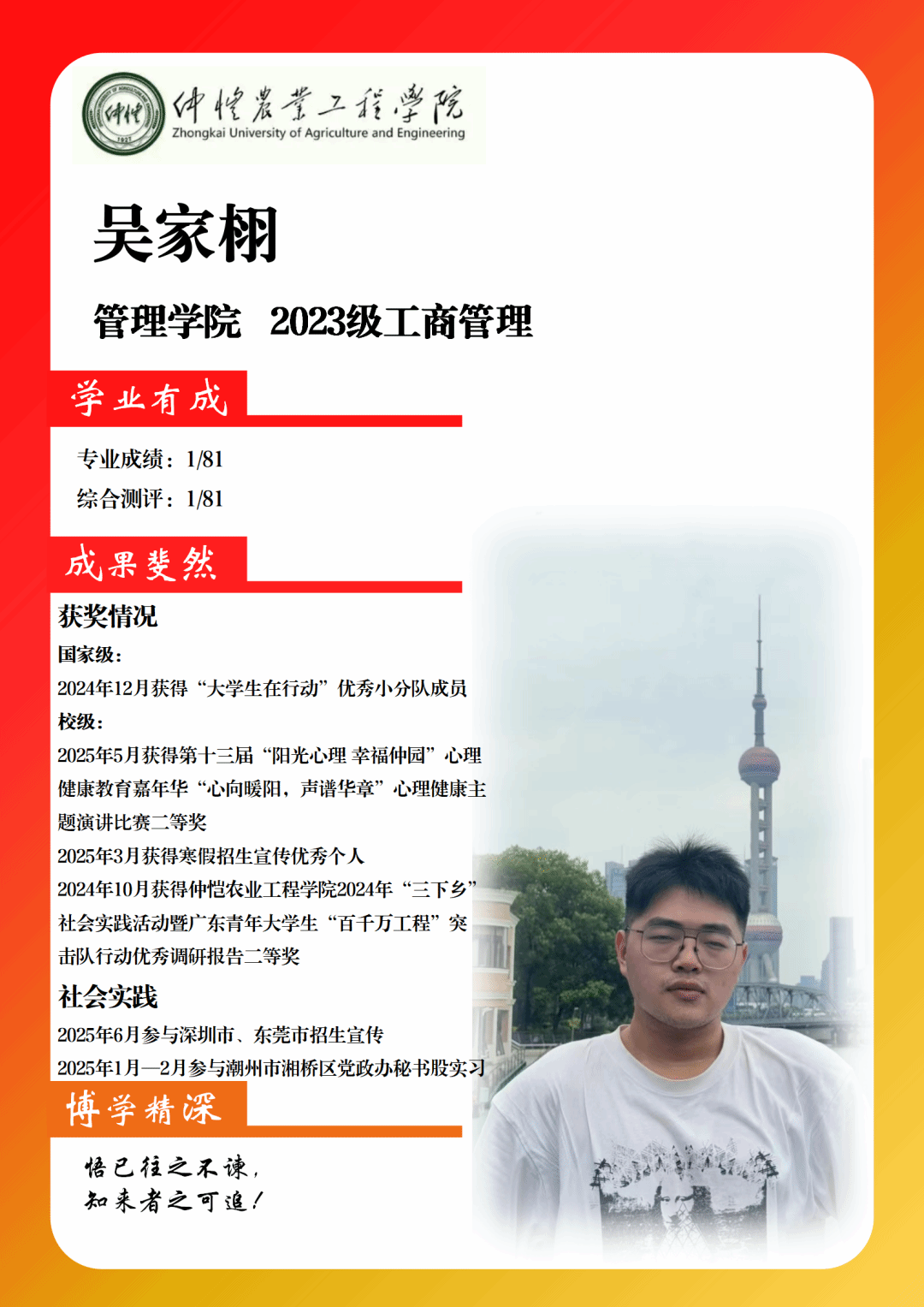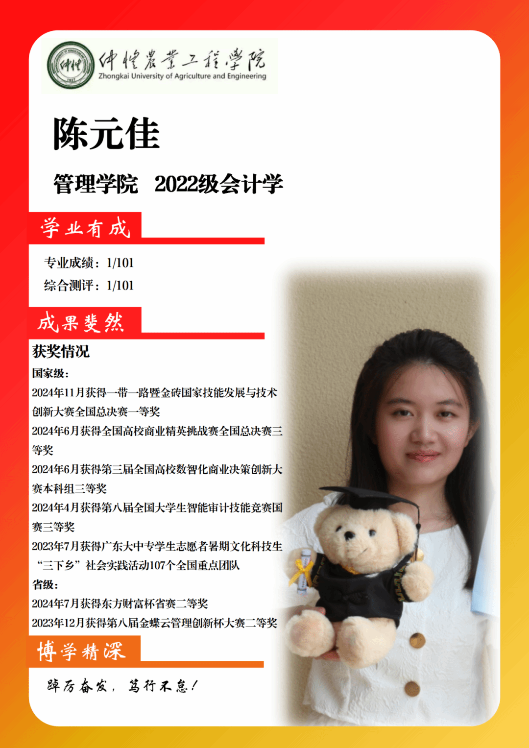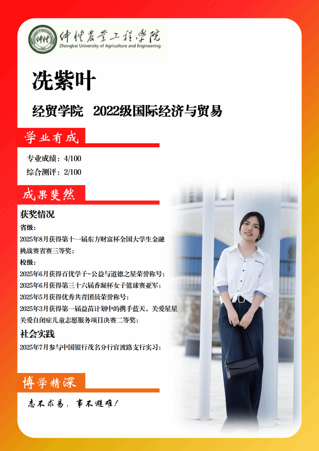 干在实处永无止境,走在前列要谋新篇,勇立潮头方显担当。国家奖学金既是对学子过往努力的肯定,更是激励其奔赴未来的强劲动力。求学之路从非坦途,唯有心怀梦想、脚踏实地,方能在耕耘中收获成长。