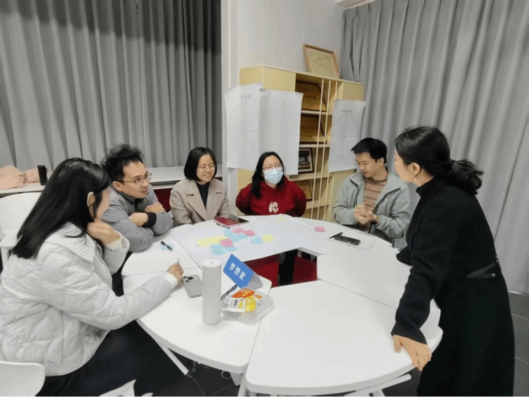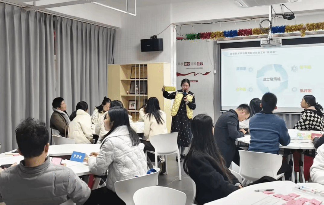 在实践共创环节,“北极星"名辅导员工作室主持人刘姝利引导各小组运用“问题簇”方法,系统梳理就业工作中最具挑战性真实议题,并对其进行精准重构。随后“迪士尼策略”角色扮演将工作坊推向深入:辅导员们分别扮演“梦想家”、“实干家”与“智慧批评家”,从愿景构想、路径规划到风险评估,共同锻造出务实而富有创见的解决方案。