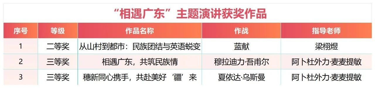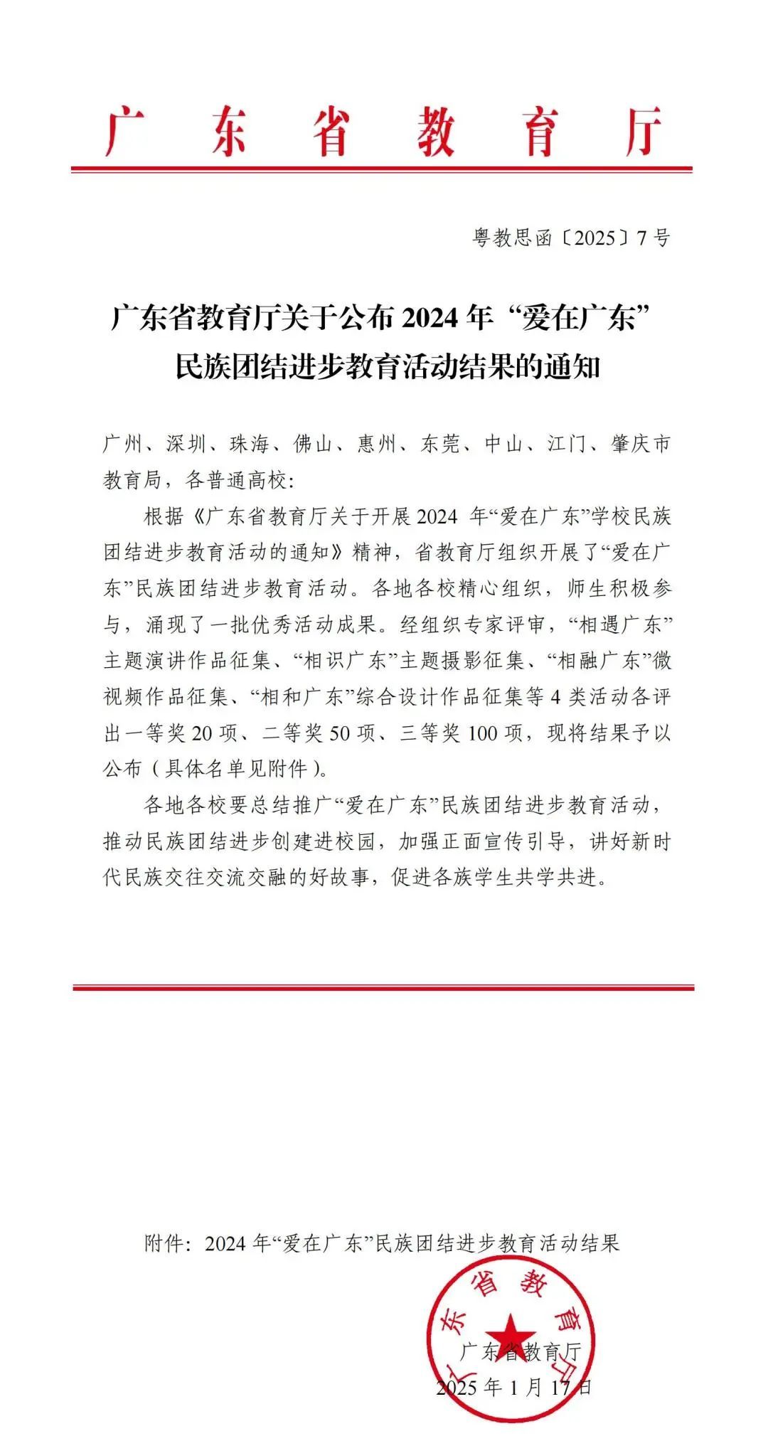近日,由广东省教育厅主办的2024年“爱在广东”民族团结进步教育活动评选结果揭晓。我校在此次活动中成绩斐然,共有11项学生佳作斩获殊荣,其中一等奖1项、二等奖1项、三等奖9项。此次获奖,不仅在层次上实现突破,数量上亦取得突破,充分彰显了我校在民族团结进步教育领域的卓越成效。