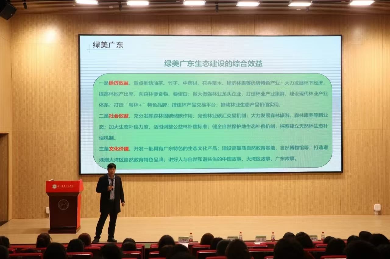 涂攀峰以“何为绿美广东”这一基础概念为切入点,详细阐述了广东生态建设“六大行动”背后的深远意义。他结合实际情况,深入剖析了广东当前的生态现状,点明了在发展过程中面临的诸多挑战,同时着重强调了生物多样性保护的重要性,让在场师生对广东生态建设有了全面的认识。他提到,各民族在文化、传统、知识等方面各具特色,在生态建设中都能发挥不可替代的独特作用。因此,他号召各民族学生携手并肩,充分发挥自身专业所学,积极投身到绿美广东建设中。