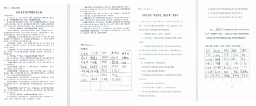 学院坚持把学风建设管理放在首位。制定了《自动化学院“课堂考勤”实施方案》,自落实学校学风建设计划以来,学院层面,召开了“紧抓班委建设 促进班风学风”——自动化学院学风建设月启动仪式暨班委培训会议。严格进行课堂考勤,加强学生社区管理,努力建设向心力、凝聚力的班集体。班级层面,各班每学期召开学风建设主题班会,对班级学情、学风、考风等方面进行了分析,引导学生进行学业规划,增强学习的内生动力,还对课堂学习秩序、宿舍生活秩序、诚信教育进行教育管理,签署《自动化学院学风建设倡议书》《自动化学院“诚信应考,拒绝作弊”承诺书》。