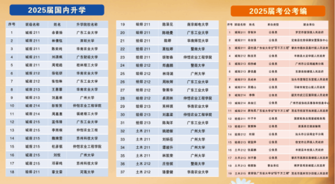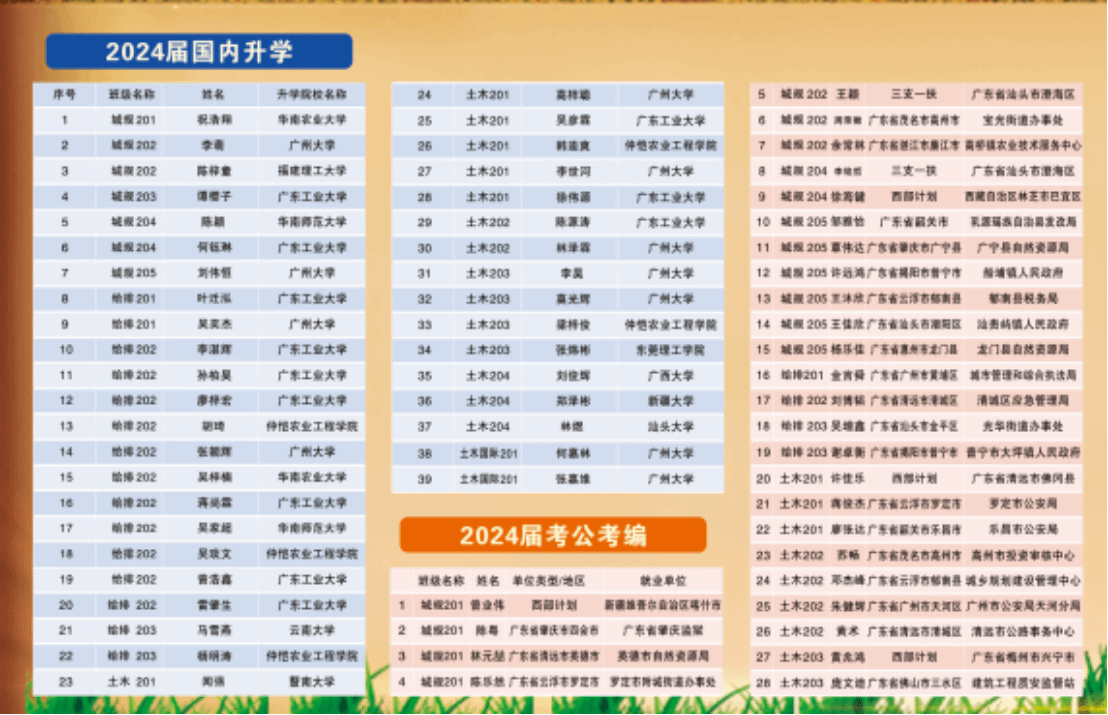 通过我院全体师生的共同努力,城乡建设学院近年来在升学就业工作方面取得了显著成绩。2024届毕业生中有44人考取研究生,28人考编成功,升学率和考编率分别为9.98%和6.34%。2025届毕业生中有54人考取研究生,19人考编成功,升学率和考编率分别为10.4%和3.66%。这些成绩充分展现了我院在人才培养方面的显著成效,为学院未来发展奠定了坚实基础。