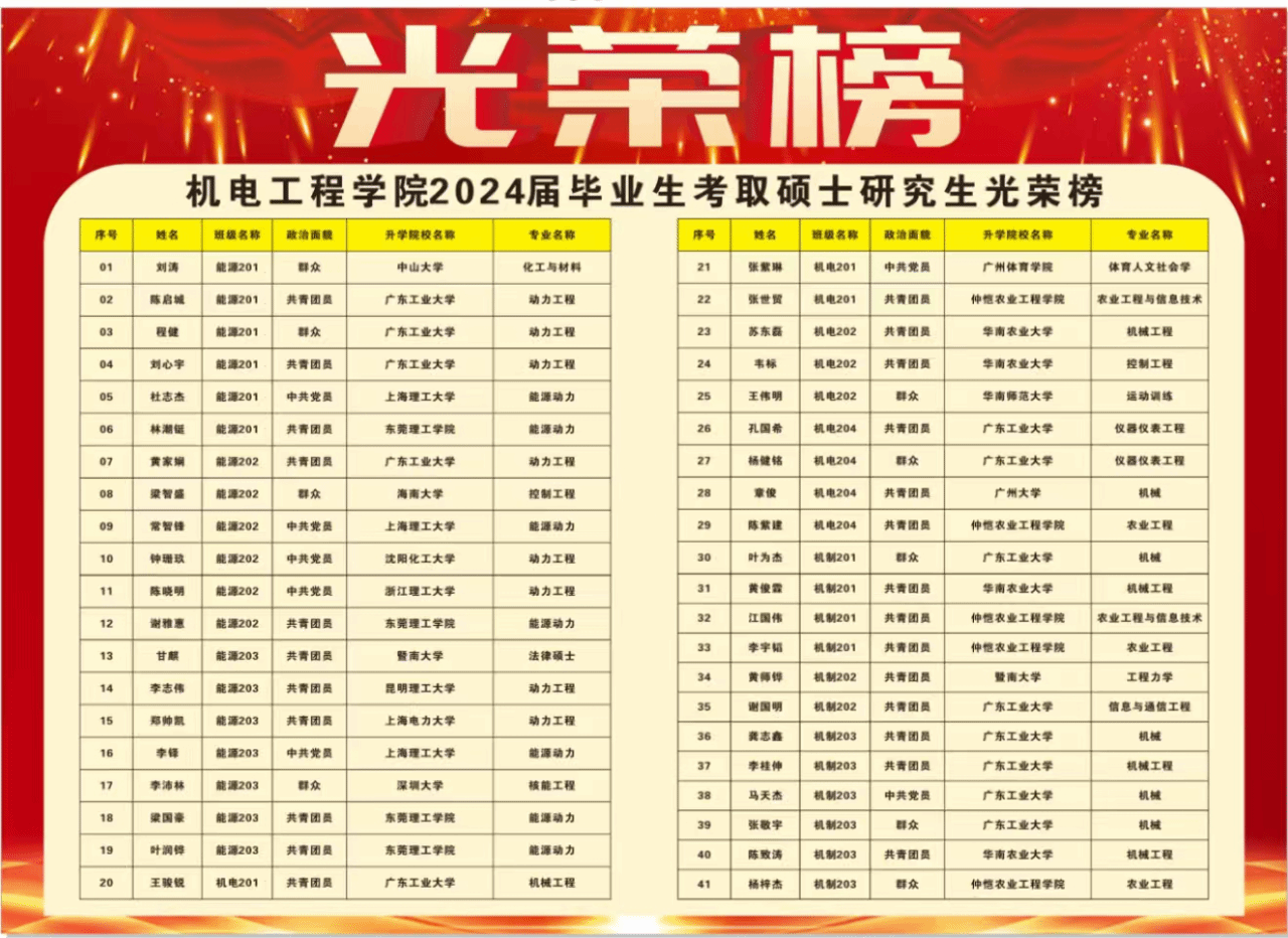 机电工程学院2024届本科毕业生共41人成功考取硕士研究生,其中录取的高校包括中山大学、暨南大学、华南农业大学、广州大学、深圳大学、广东工业大学、上海理工大学、沈阳化工大学等。考研上岸毕业生的奋斗事例为有升学意向的低年级学生提供“方向指引”和“精神激励”,营造积极向上的备考氛围。