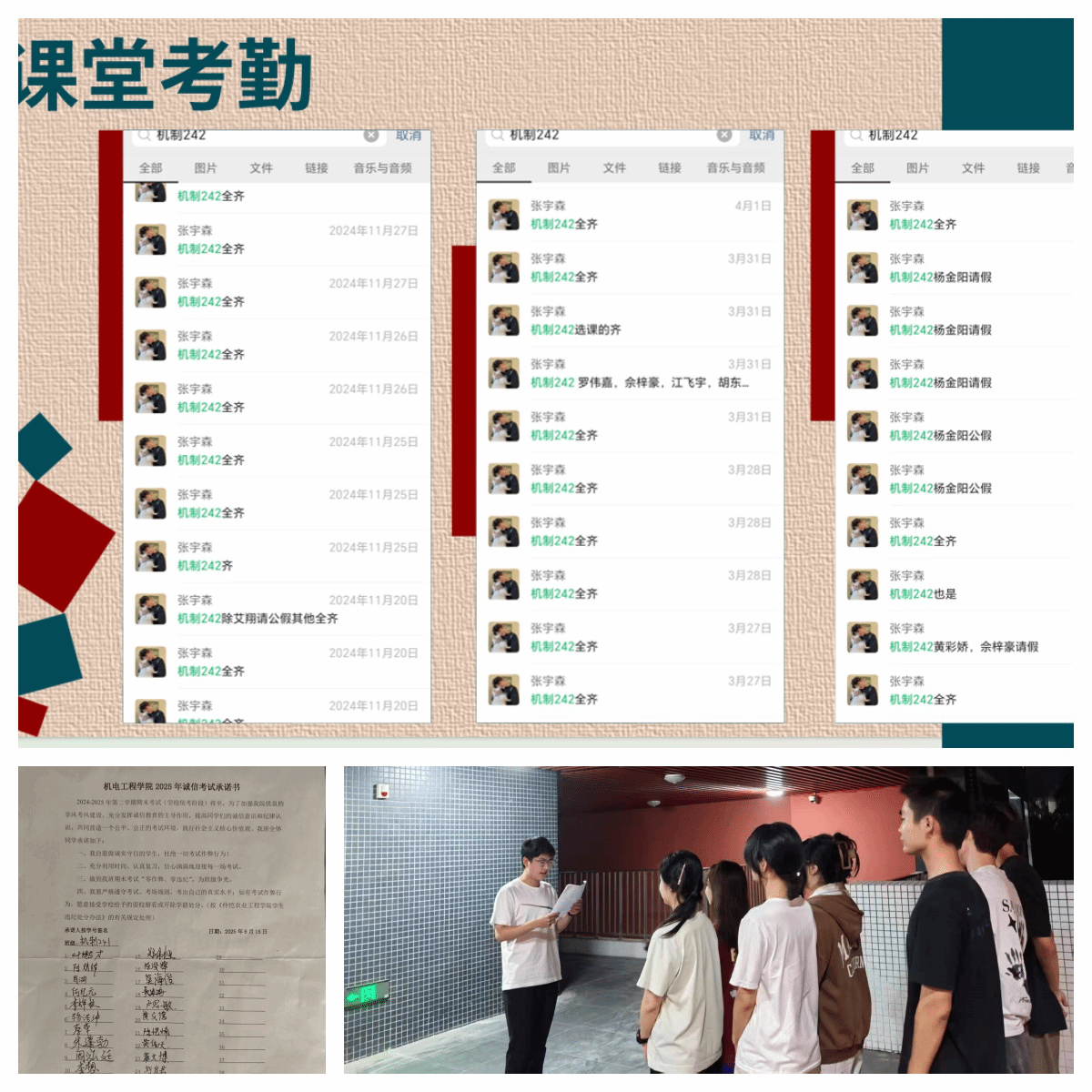 机电工程学院重视考风考纪教育,以诚信教育为根本,织密学风建设防控网络,引导学生树道德之新风,立诚信之根本,提高自身修养,增强责任意识,展现真才实学。学院采用课堂考勤打卡,由每个班副班长每节课上课后15分钟内接龙打卡方式,规范课堂纪律,减少迟到、早退、旷课及课堂使用电子设备等不良现象,培养学生自律意识和时间管理能力。学院加强学术道德教育,严肃考风考纪,杜绝考试作弊、论文抄袭等学术不端行为,组织学生考前签订考试诚信承诺书,营造公平诚信的学术环境。