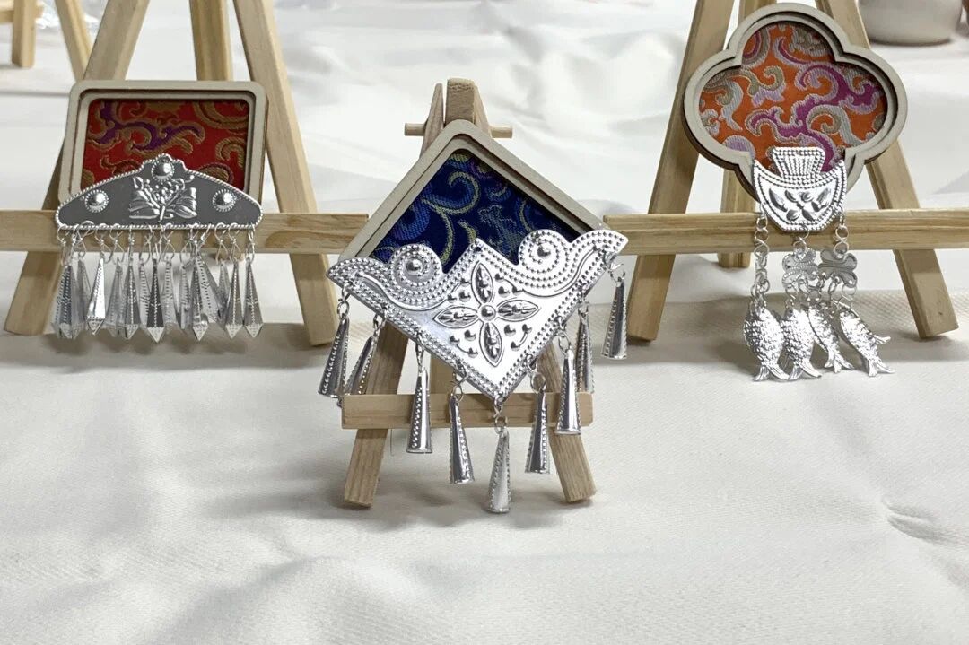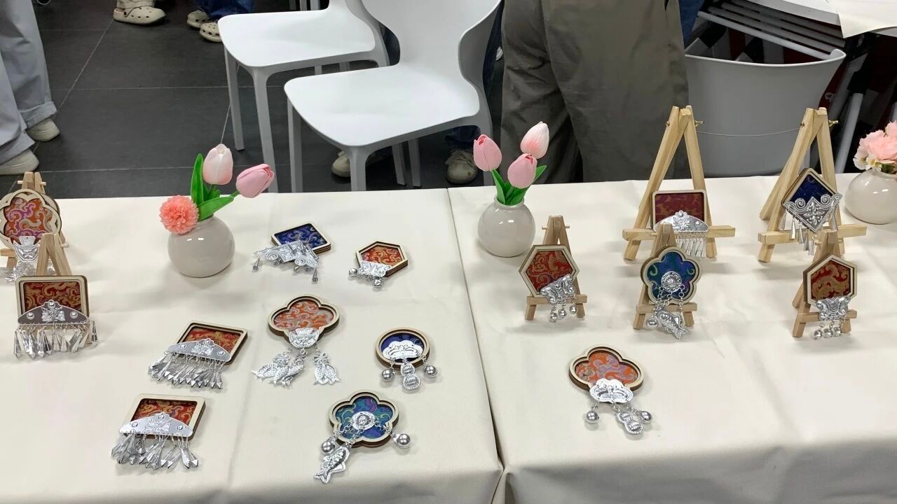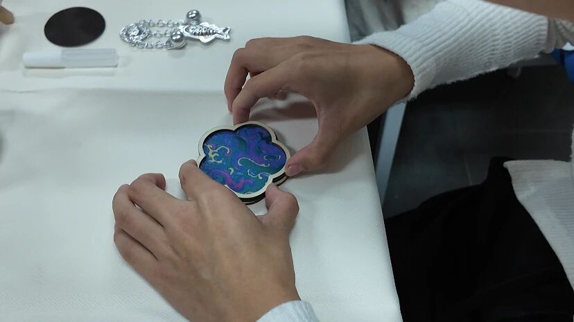 同学们认真挑选心仪的宋锦样式面料,投入宋锦冰箱贴制作之中——比对木框调整纹路、均匀涂胶粘合、搭配苗银配件点缀,一件件独特的“非遗艺术品”诞生于指尖,同学们在沉浸式手作中感受课余慢时光的疗愈,让每一件作品都成为非遗与个人创意的结合。