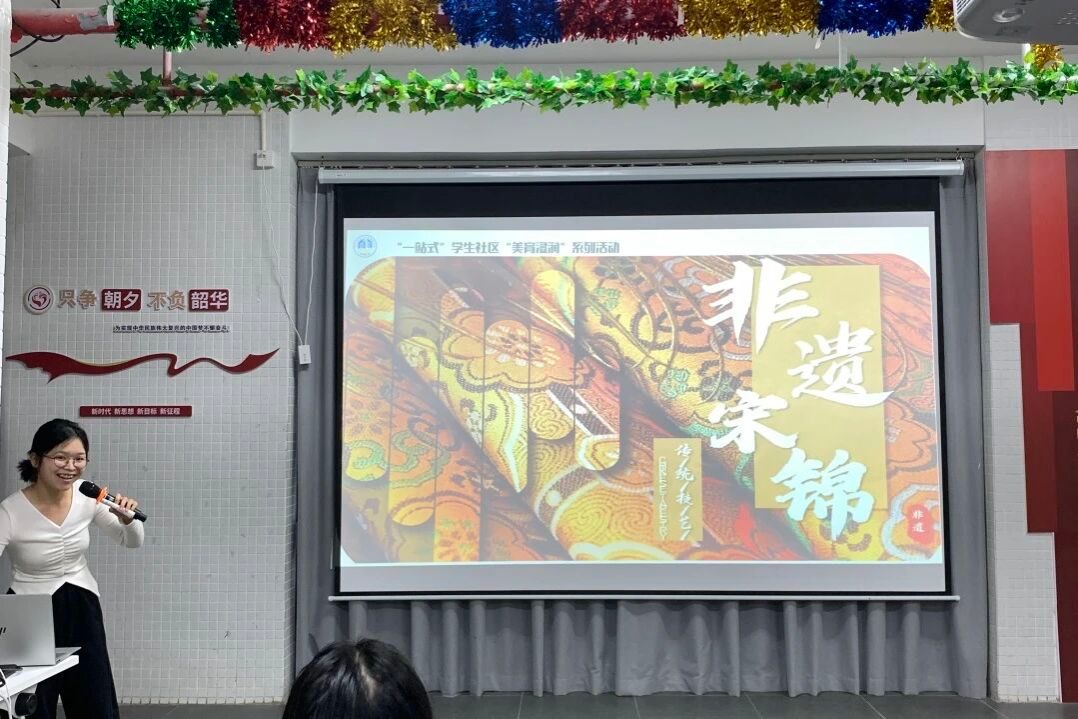 活动伊始,自管委工作人员从四大名锦的特色切入——宋锦典雅文气、云锦华美高雅、蜀锦明艳古朴、壮锦热烈质朴,接着围绕宋锦独特的文化背景与历史展开讲解,并分享了非遗宋锦传承人钱小萍“尽最大努力,不留遗憾”的坚守故事,由浅入深地让同学们认识宋锦、走进宋锦、感悟宋锦文化。