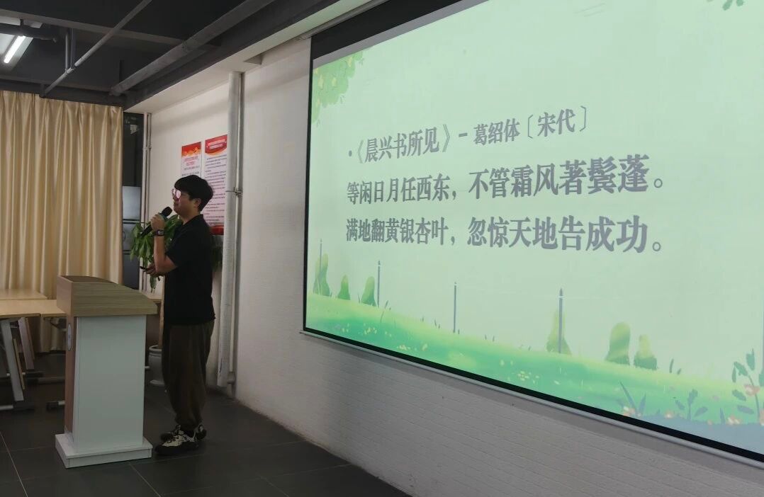 最后,于昕塍以宋代诗人葛绍体的一首七言绝句——《晨兴书所见》结尾,借诗词所述之意境,诠释了超越时空的对“丰收”之喜悦的赞美。他以银杏坚韧精神寄语同学们:在竞争激烈的社会中锻炼核心竞争力,带着坚韧与热情学习、求职、成长,让人生如秋日银杏叶般绚烂。