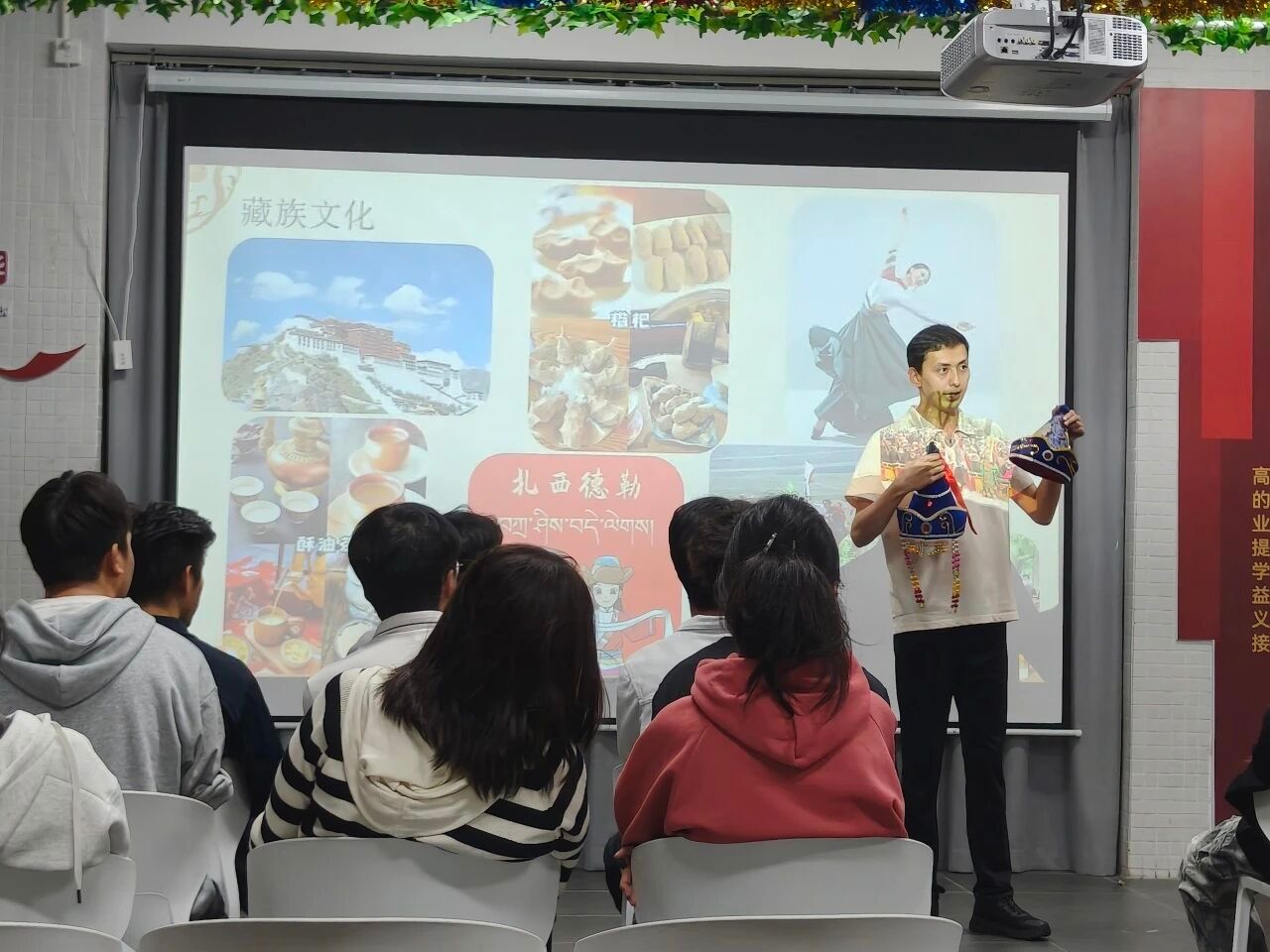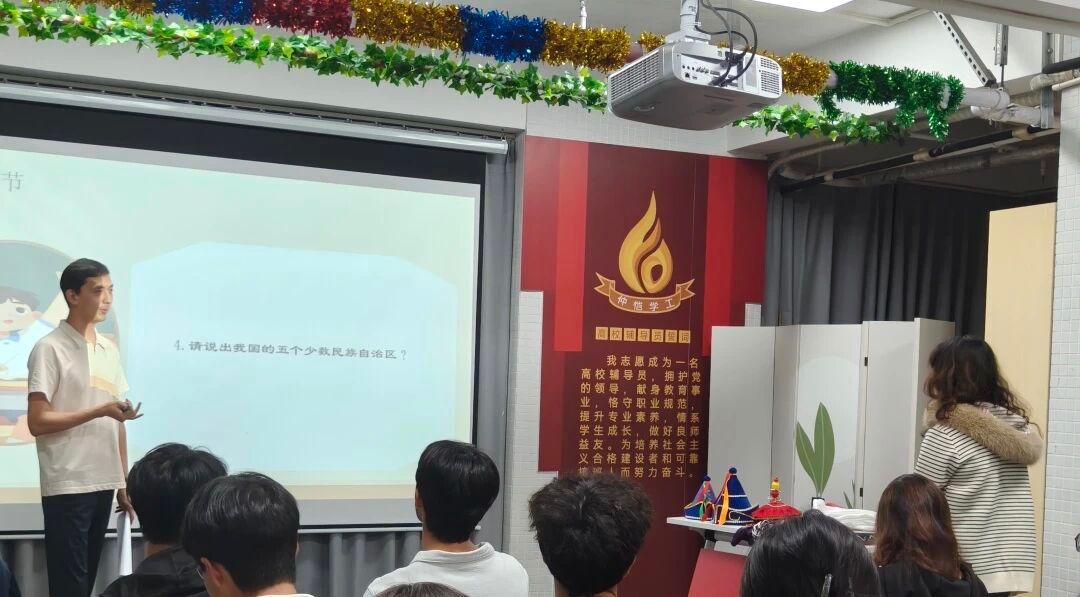 知识问答环节更是干货满满 ——“藏族的传统节日是哪一个?”“哪些民族乐器搭配正确?”,一道道题目让大家在思考中巩固知识点,同时,通过服饰图片辨认民族,沉浸式感受各民族的审美特色,最后关于五个少数民族自治区的提问,更是让 “民族团结” 的地理认知深入人心。此次宣讲,不仅让同学们领略了各民族的文化魅力,更读懂了 “民族团结” 的重量。56个民族就像石榴籽一样,虽然各有特色,却始终紧紧相依。愿我们都能做民族团结的守护者、文化传承的接力者,让民族之花永远璀璨绽放!