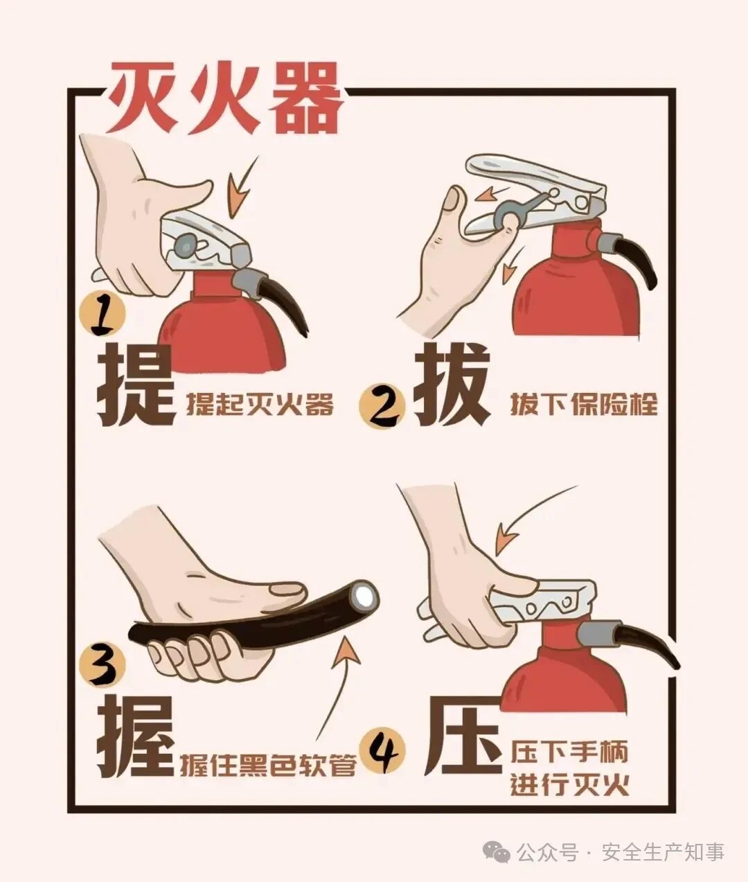 熟练掌握灭火器“提、拔、握、压”的使用步骤:明确其适用的火灾类型,遇到初期小火时能冷静果断处置。