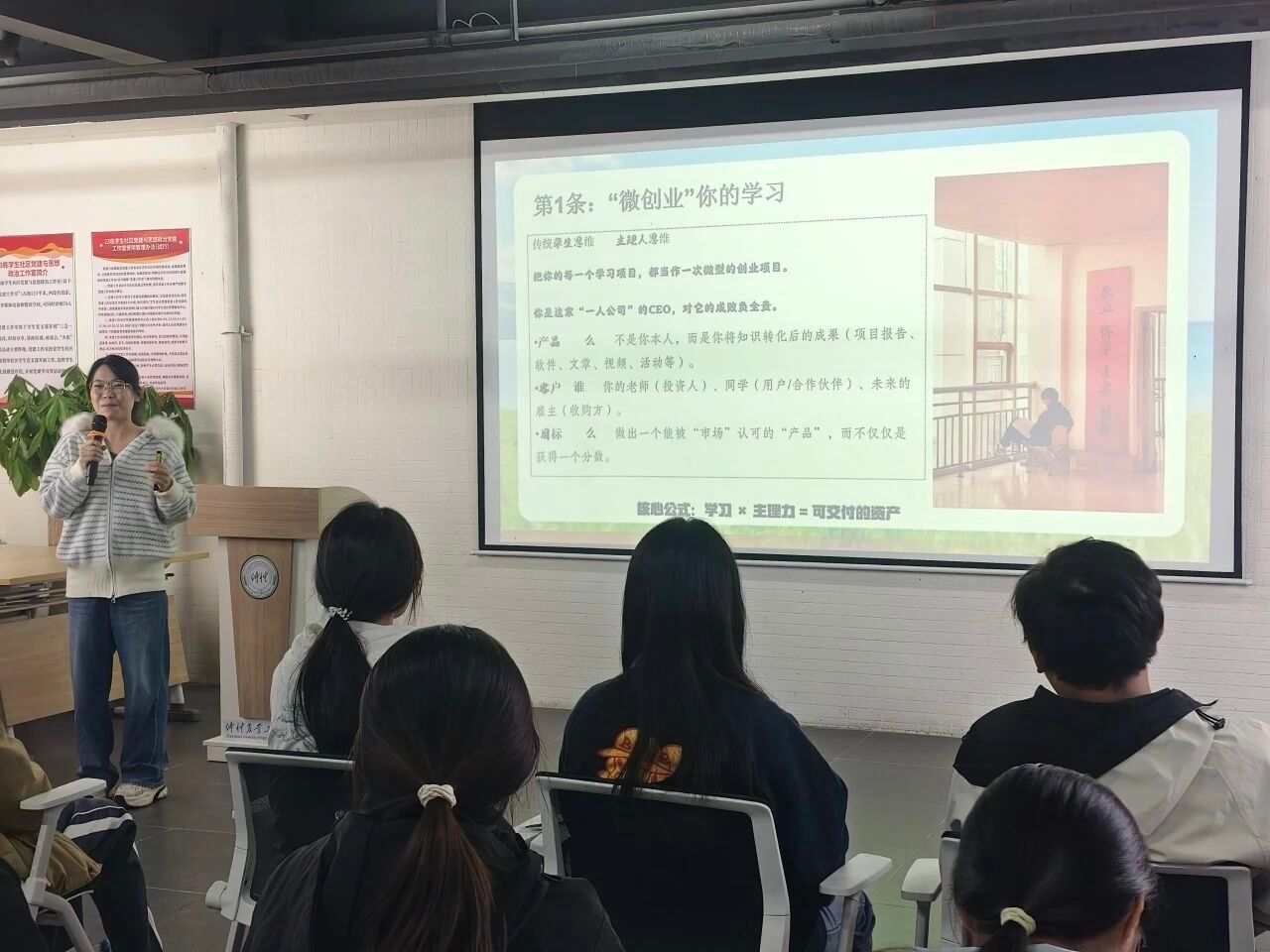 接着,黄慧娟从主体意识、能力构建及价值创造三个方面解析“主理力”内核。 从 “要我做”“有想法”“做完事” 到 “我要做”“有方法” “做成事”,鼓励同学们将不确定性转化为机遇,让 “主理力” 从口号变为行动。黄慧娟总结出了4 条落地路径:“微创业” 你的学习、“项目化” 你的兴趣、“负责制” 你的社团工作以及用“产品经理” 思维对待求职,以浅显易懂的示例,手把手指引同学们找到自身“成长点”。
