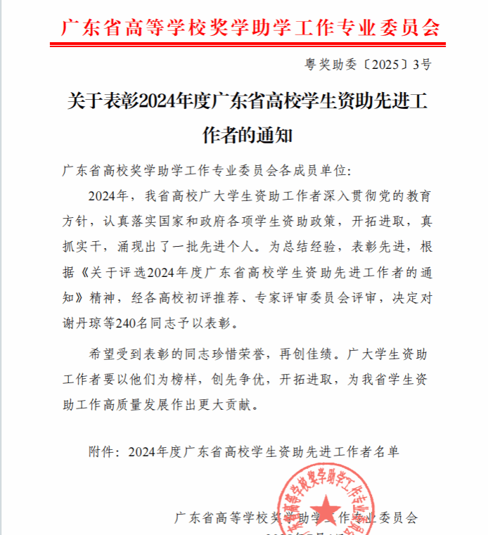 一直以来,我校注重强化资助工作队伍建设,通过加大资助系统培训、深化专业研讨,显著提升了资助队伍的专业化水平与服务能力。今年,我校资助工作队伍再创佳绩,叶佳琪、聂恺阳、黎耀元三位老师荣获“2024年度广东省高校学生资助先进工作者”荣誉。
