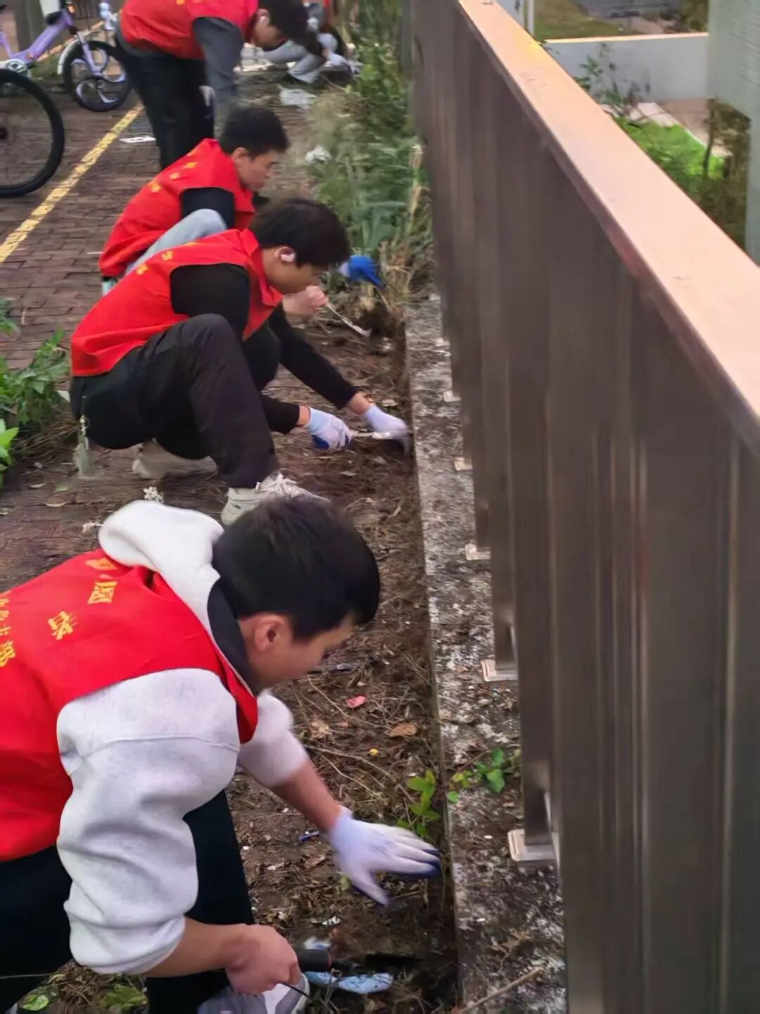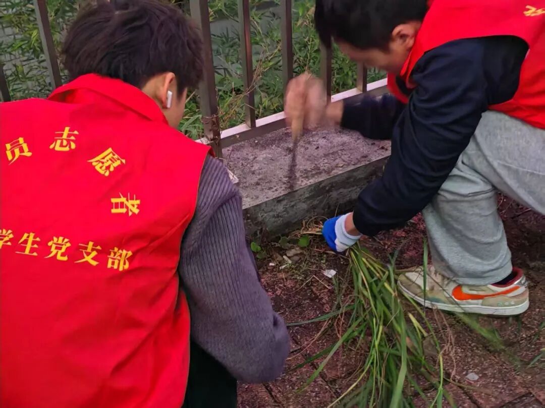 本次活动中,志愿者们手持镰刀、扫把与垃圾袋,前往19-23栋宿舍四周,分工有序开展清洁工作。将红砖缝隙中的杂草、垃圾全部清理掉。