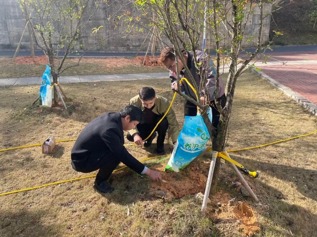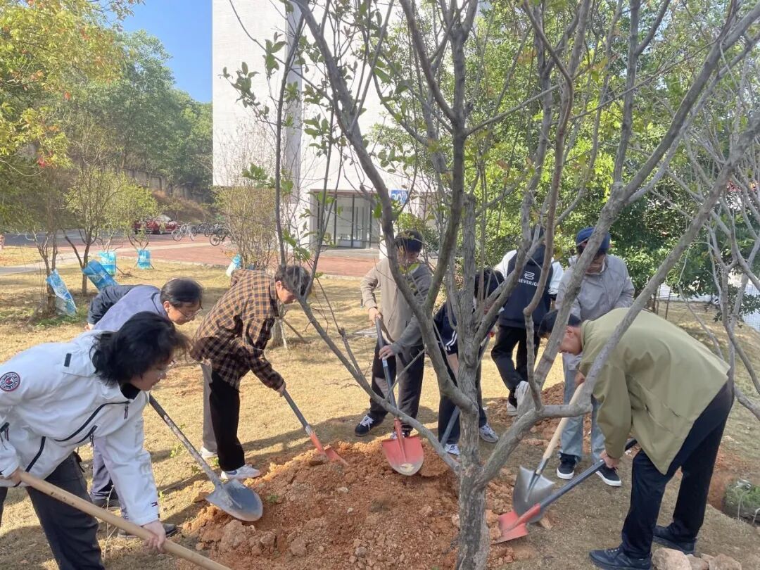 携手植绿,播种团结 活动现场,师生们分工协作,扶苗、填土、浇水,将一棵棵承载美好寓意的树植入土壤。涂攀峰副教授现场讲解种植技巧。