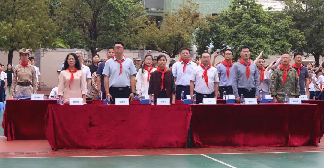 上午8时20分,滨江东路小学操场气氛庄重。在仲恺农业工程学院学生军事教导大队国旗护卫队的护卫下,五星红旗冉冉升起,拉开了活动序幕。随后,仲恺农业工程学院、滨江街道联合海珠区退役军人事务局、海珠区教育局、广州市海珠区滨江东路小学共同为“红色传承志·仲戎青年说”政校社共建共育实践基地揭牌,标志着两校在国防教育领域的深度合作正式启动。