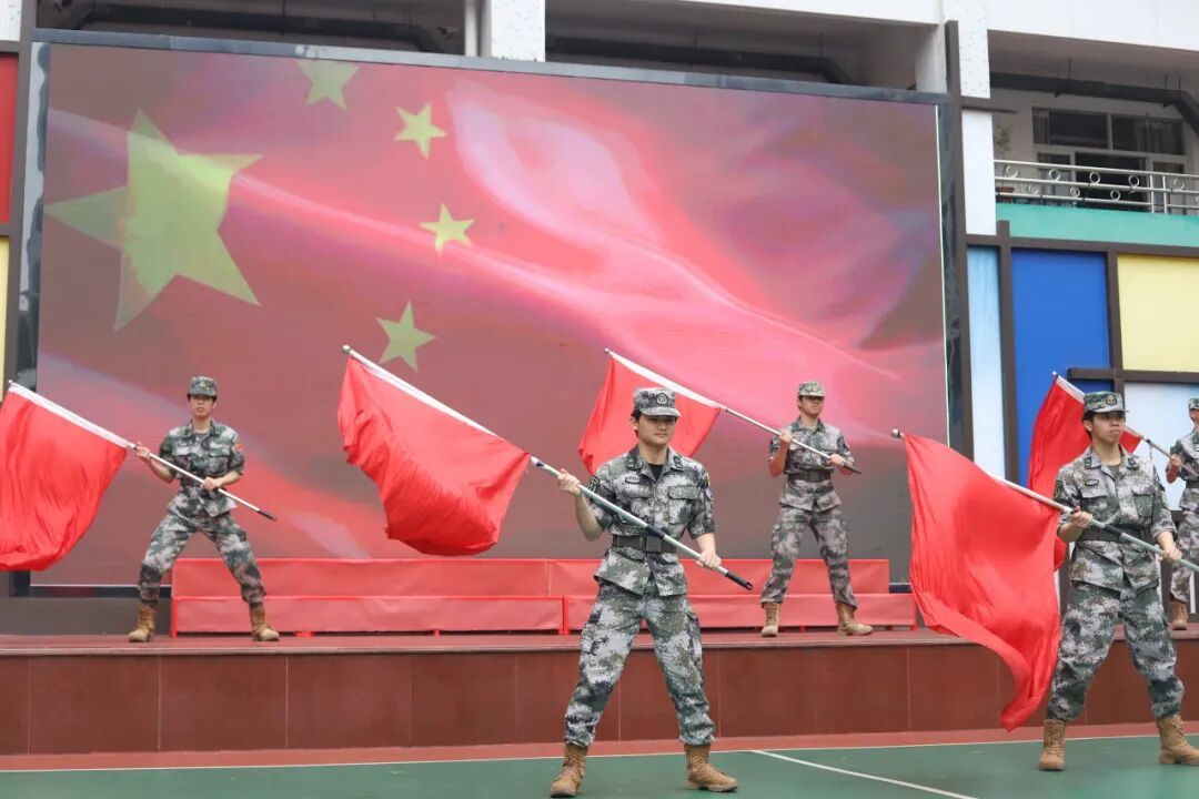 随后,学生军事教导大队舞旗方阵带来《擎旗向未来》主题展演。队员们手持彩旗,步伐铿锵,通过“红旗漫卷”“青春飞扬”等队列动作,展现了仲恺学子昂扬的精神风貌。整齐划一的舞旗表演,不仅彰显了军事训练的严谨与过硬,更传递了“听党指挥、能打胜仗”的坚定信念。