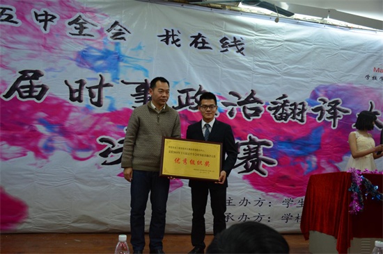 12月16日晚,由学生处主办、学生事务管理服务中心承办的十八届五中全会时事政治翻译大赛决赛在白云校区圆满落幕。学生处副处长昌灯圣、李阳疯狂英语集训营主教练林嘉汛等担任决赛评委。