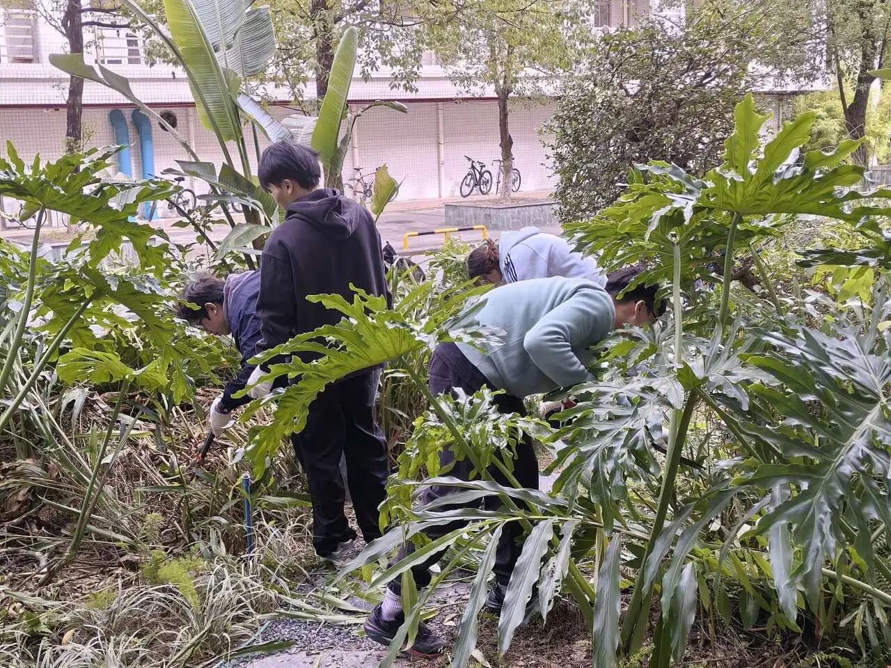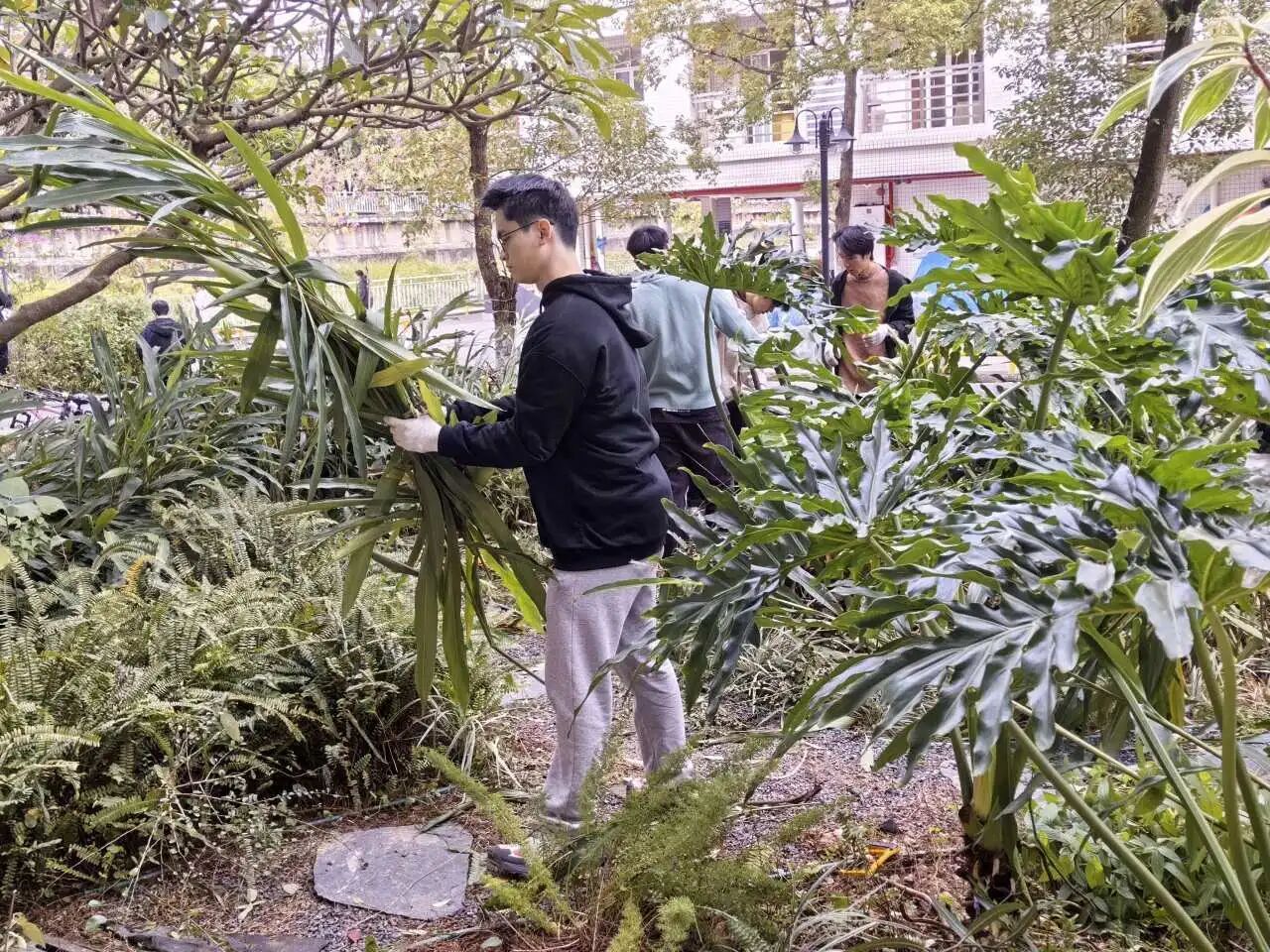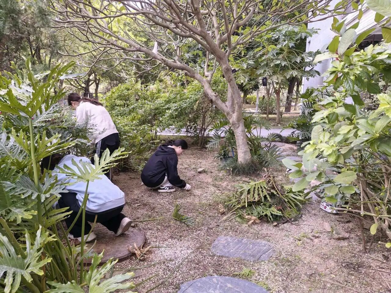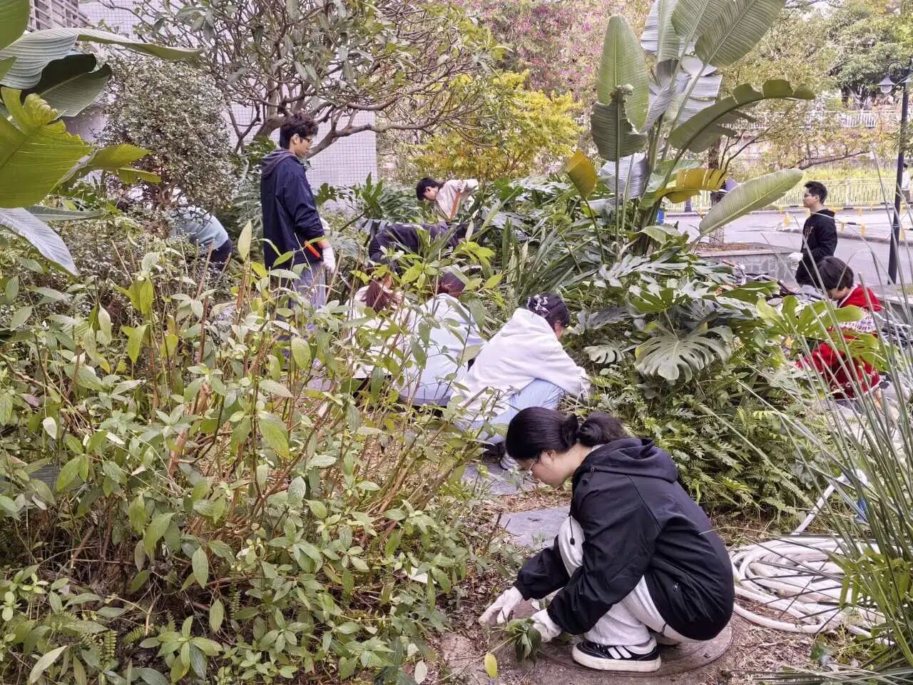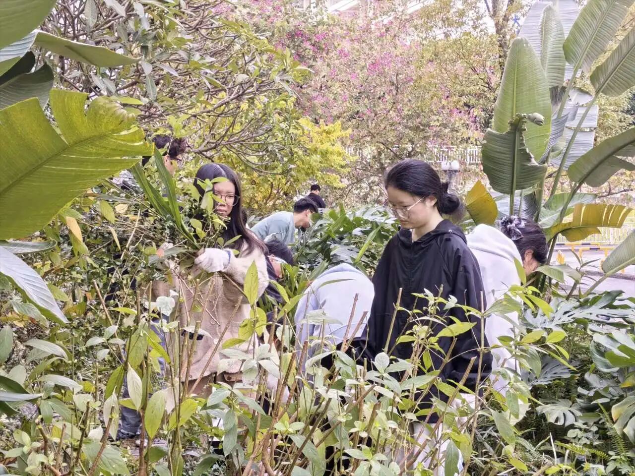 在罗老师的指导和心晴园艺部学生的协助下,同学们热情投入到花园的各类劳作体验中。大家分工协作,有序进行了修剪植物的枝条、收拾残枝枯叶、拔除干枯的植物和杂草、清理落叶垃圾等劳作。过程中,同学们不仅学习了基础的园艺知识和技能,更在亲手劳作、触摸泥土、照料植物的亲密互动中,感受到了自然的疗愈力量。