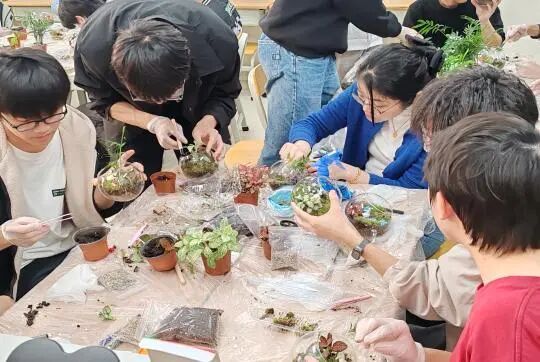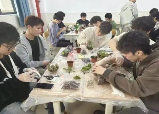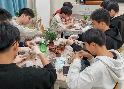 在微景观制作环节中,同学们在罗欣欣的指导下,有条不紊地展开创作。他们先铺设底层基质,再小心翼翼地植入背景植物,接着铺设苔藓,搭配上可爱的小摆件与彩色砂石,一个个充满个性与巧思的微景观逐渐成型——有宁静致远的“山水意境”,有生机盎然的“森林一角”,也有充满童趣的“童话王国”。