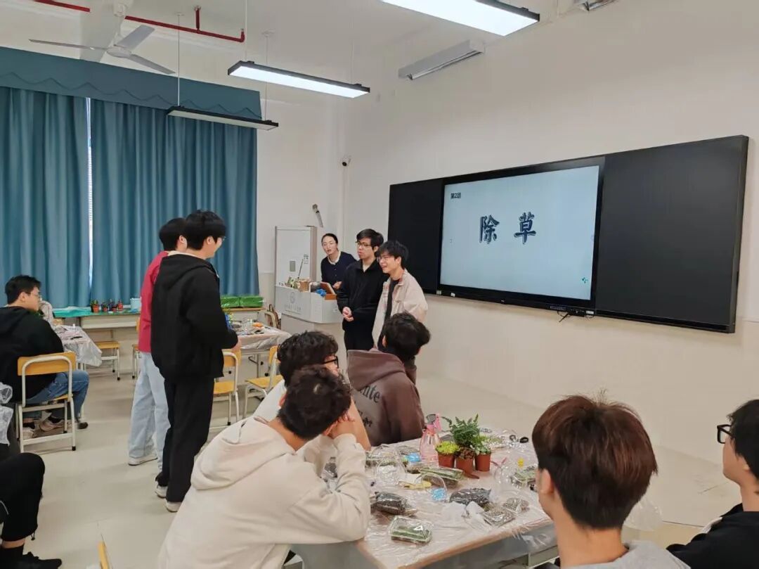 活动在轻松愉快的暖场游戏中有序展开。在“你来比划,我来猜——园艺物语版”环节中,“爬山虎”“蝴蝶兰”“除草”“修剪”等园艺关键词通过夸张的肢体动作被同学们生动呈现。同学们脑洞大开、默契配合,在笑声中悄然拉近了彼此的距离。而“发现我的生态系统”环节则启发了同学们思考“我的生态系统”三要素:我的根基(土壤)、我的成长(植物)及我的滋养(水),在交流中唤醒对生命和生活的感知,为后续的园艺疗愈体验做好了铺垫。