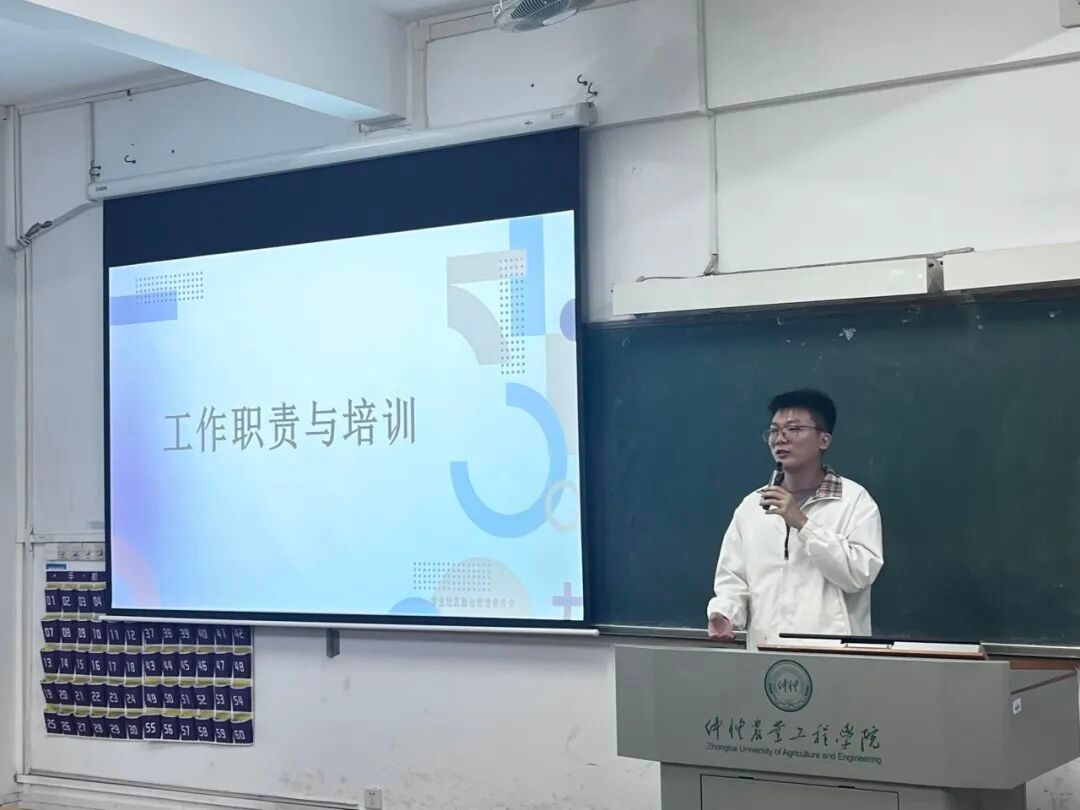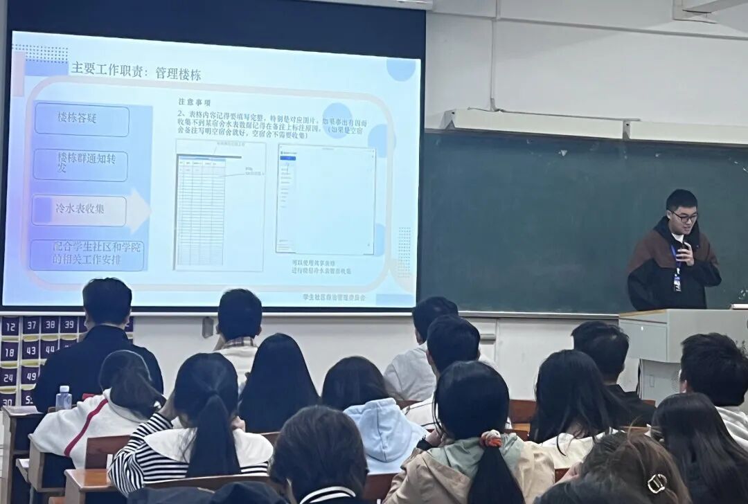 学生社区辅导员万卓为介绍了我校学生社区自治管理模式的发展历程,强调学生参与的重要性,并详细讲解楼栋(层)长具体的工作职责与要求。